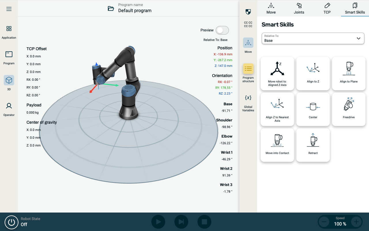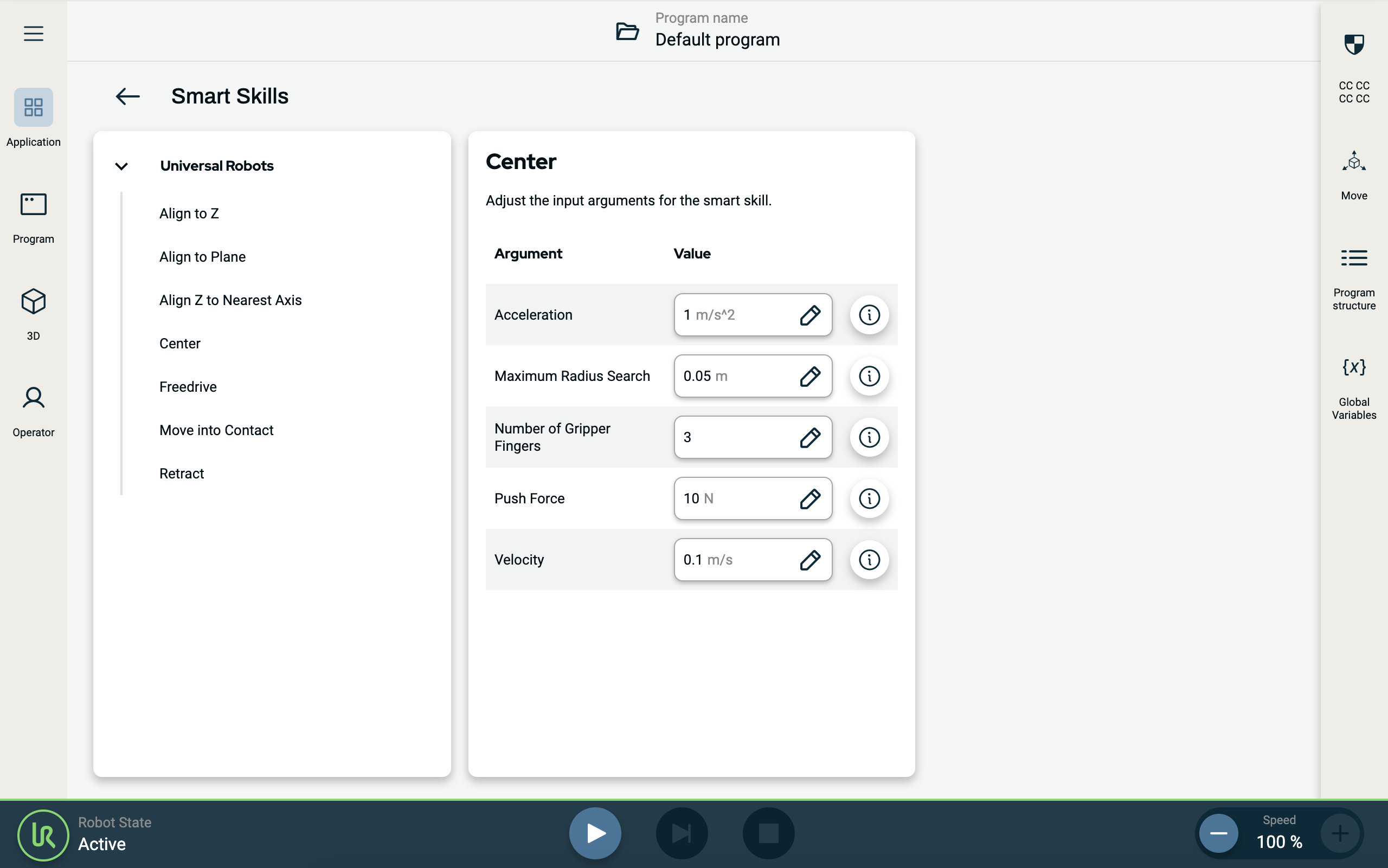 Reinstall the URCap with the new smart skill presenter and open the Smart Skill application node to see your new settings view.
