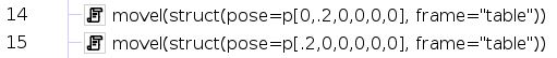 This commands the robot to complete two movel commands to specified poses expressed in the “table” frame. The poses in the “table” frame match the placements of “cornerA” and “cornerB” so the robot appears to move to “cornerA” when completing line 14 and to “cornerB” when completing line 15.