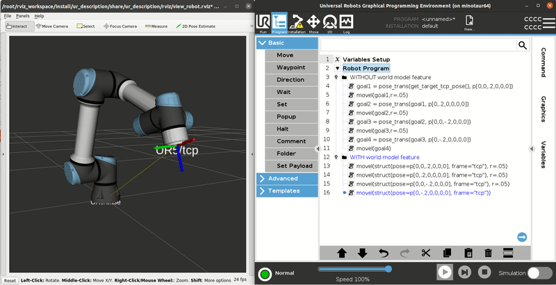Brief: In this example, we show how to use the movel command with frames to follow trajectories that are defined relative to the robot’s TCP. It shows a comparison of how the trajectory can be performed using pose_trans vs using movel with a struct argument.